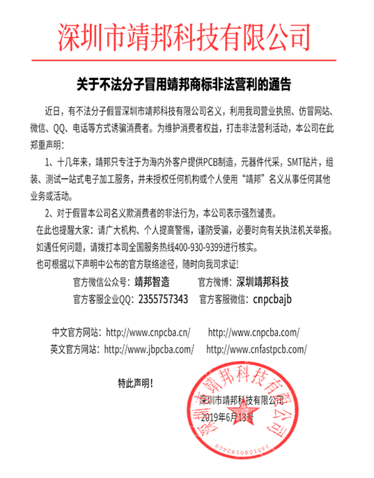 深圳靖邦科技有限公司是一家专注PCB、PCBA制造十五年的民族企业,公司拥有一批十几年积淀的工程团队和专业的电子元器件采购团队,服务于国内外众多汽车电子、医疗电子、电力通讯、工业自动化和智能家居等各行业客户,是一家集PCB制造、电子元器件代采、SMT贴片加工及测试组装一站式综合制造服务商,2017年电子加工行业的标杆企业。